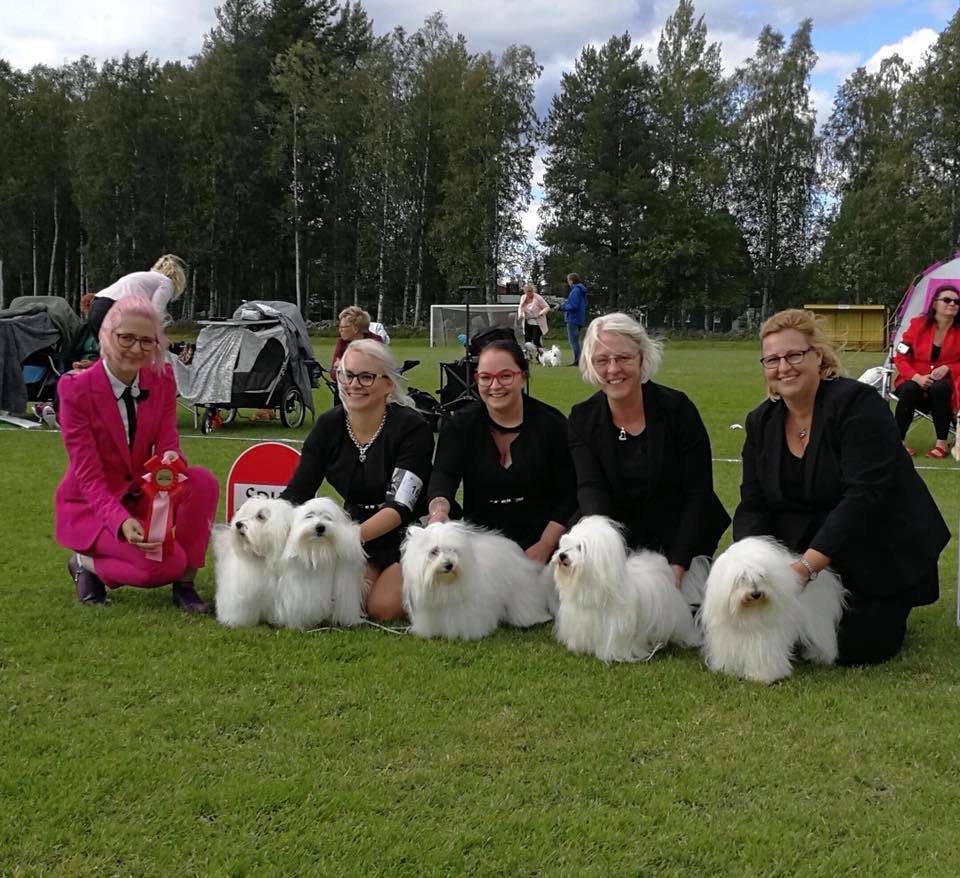 Saavutimme myös yhden unelmistani, kun saimme elokuussa 2018 kasaan Charlotan jälkeläisryhmän. On harvinaista saada nartusta jälkeläisryhmää ja vielä siten, että kaikki osallistuneet koirat olivat Rouva Kuningattaren tyttäriä. Charlotan jälkeläisryhmä oli tässä näyttelyssä Luleåssa myös BEST IN SHOW jälkeläisryhmä!